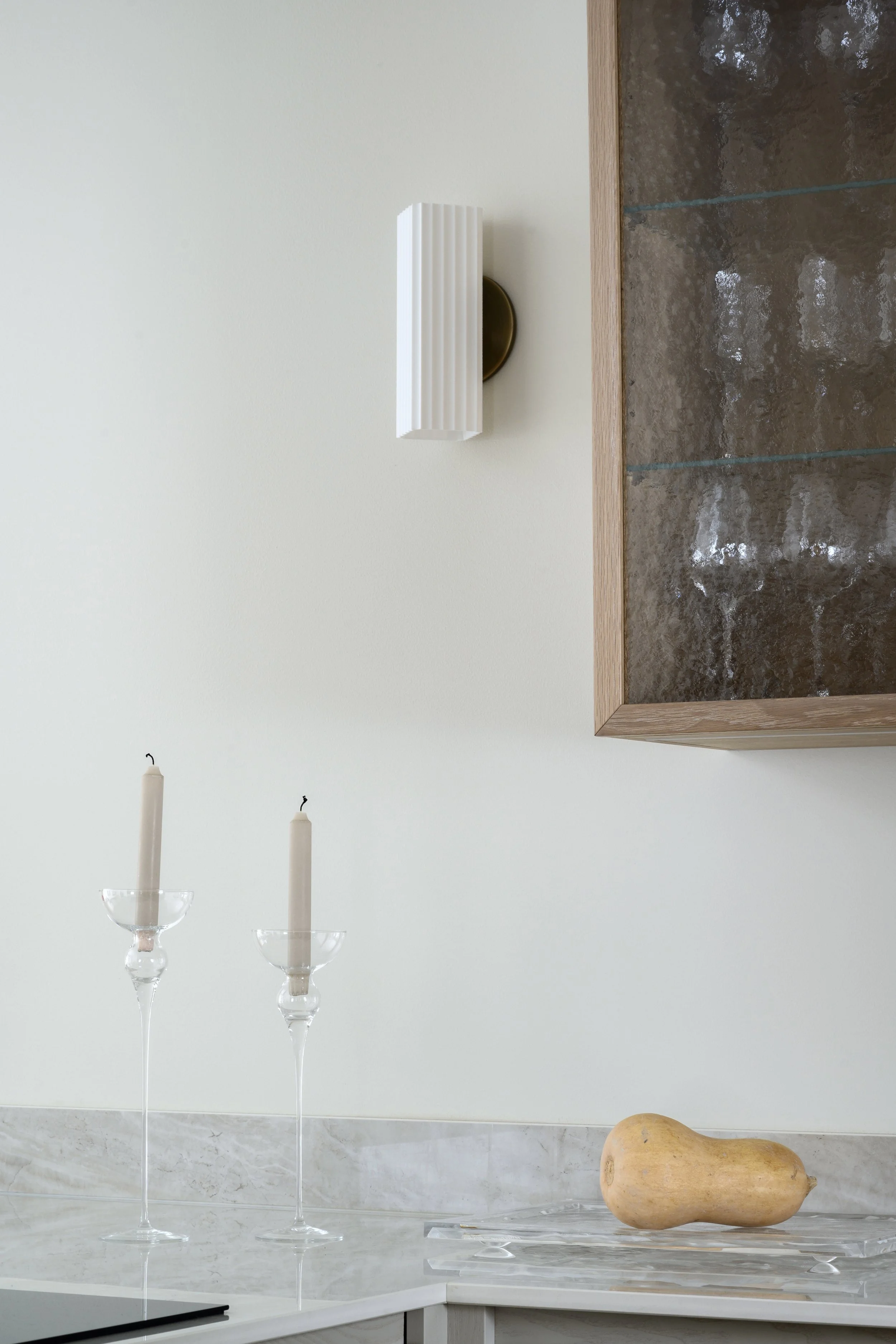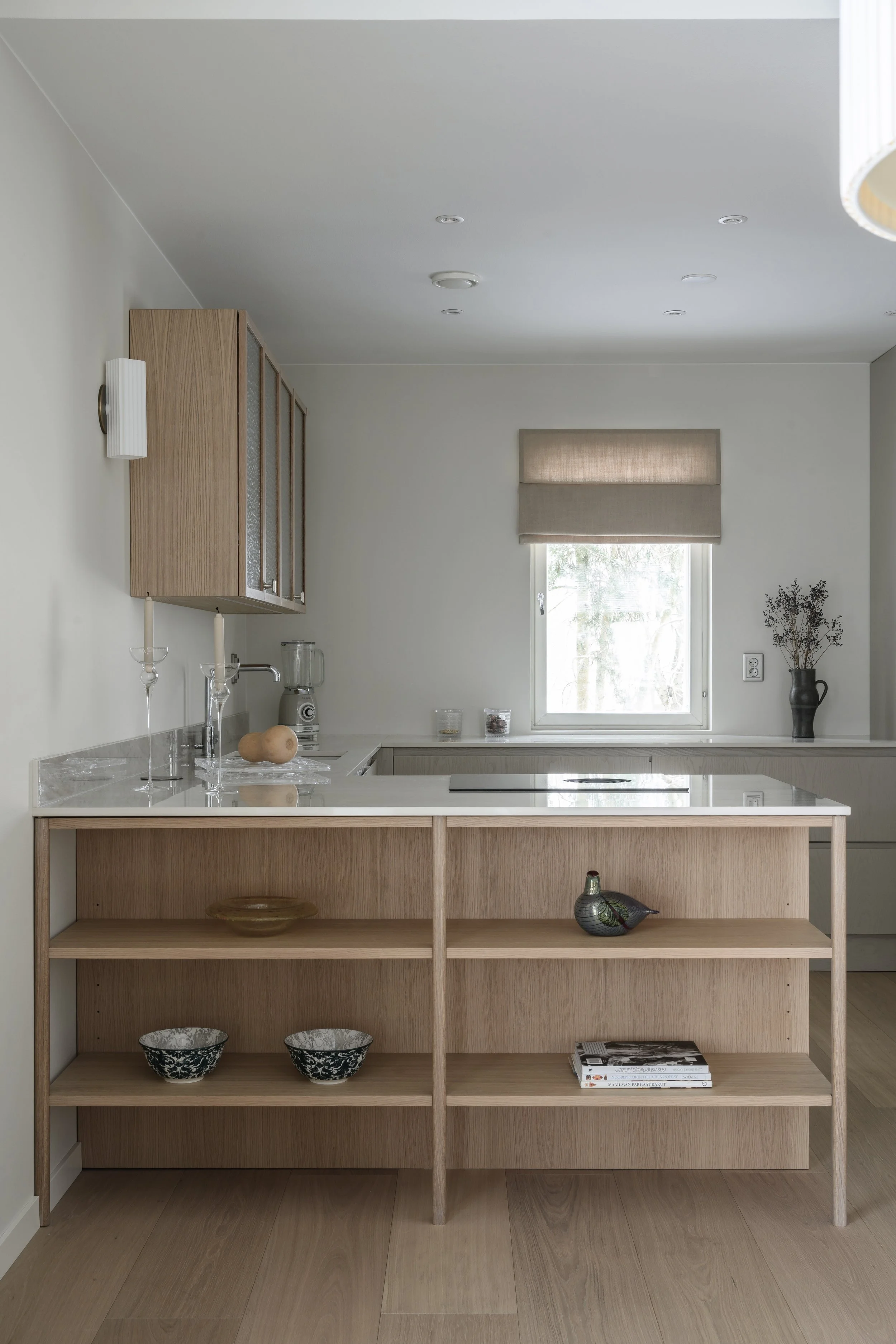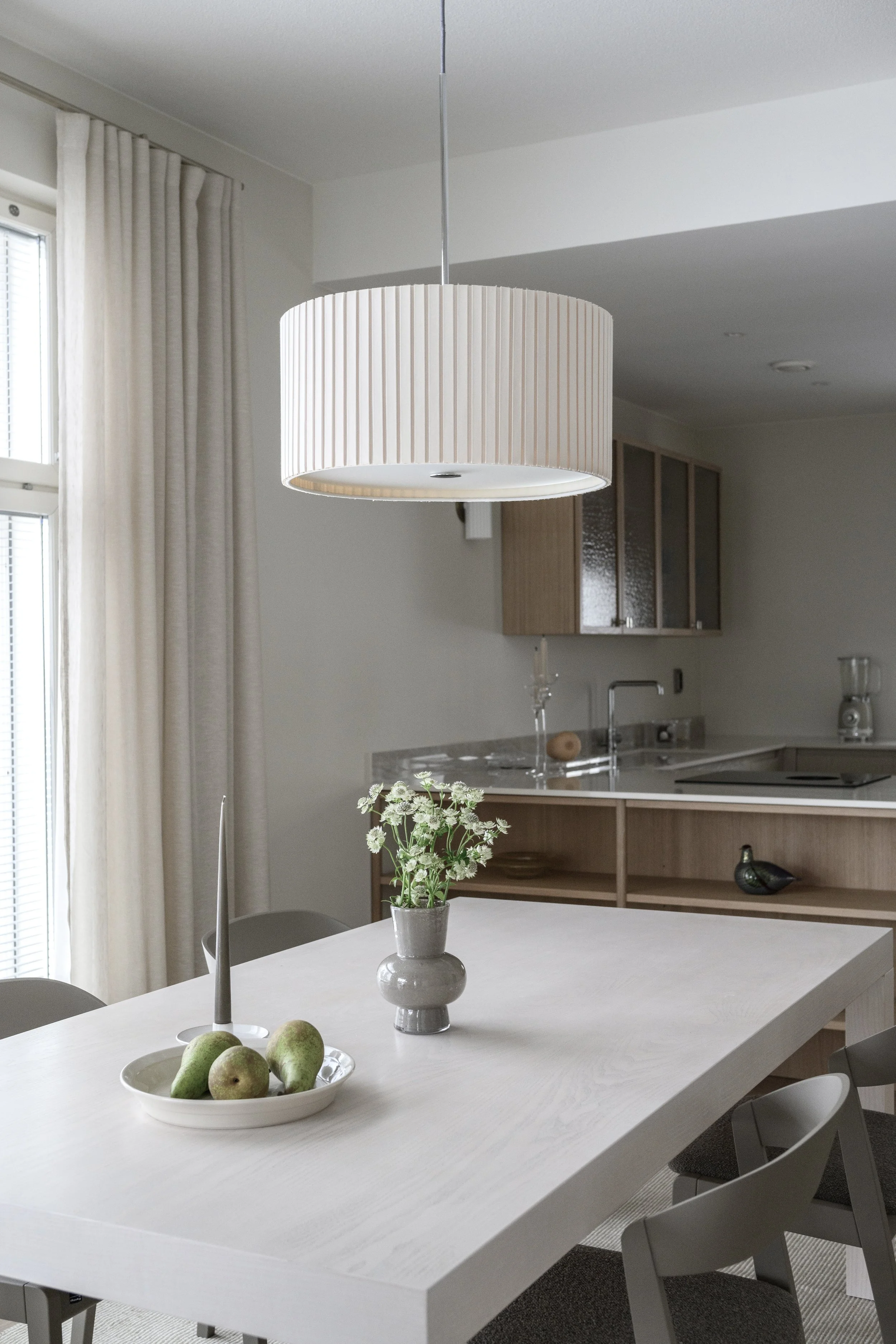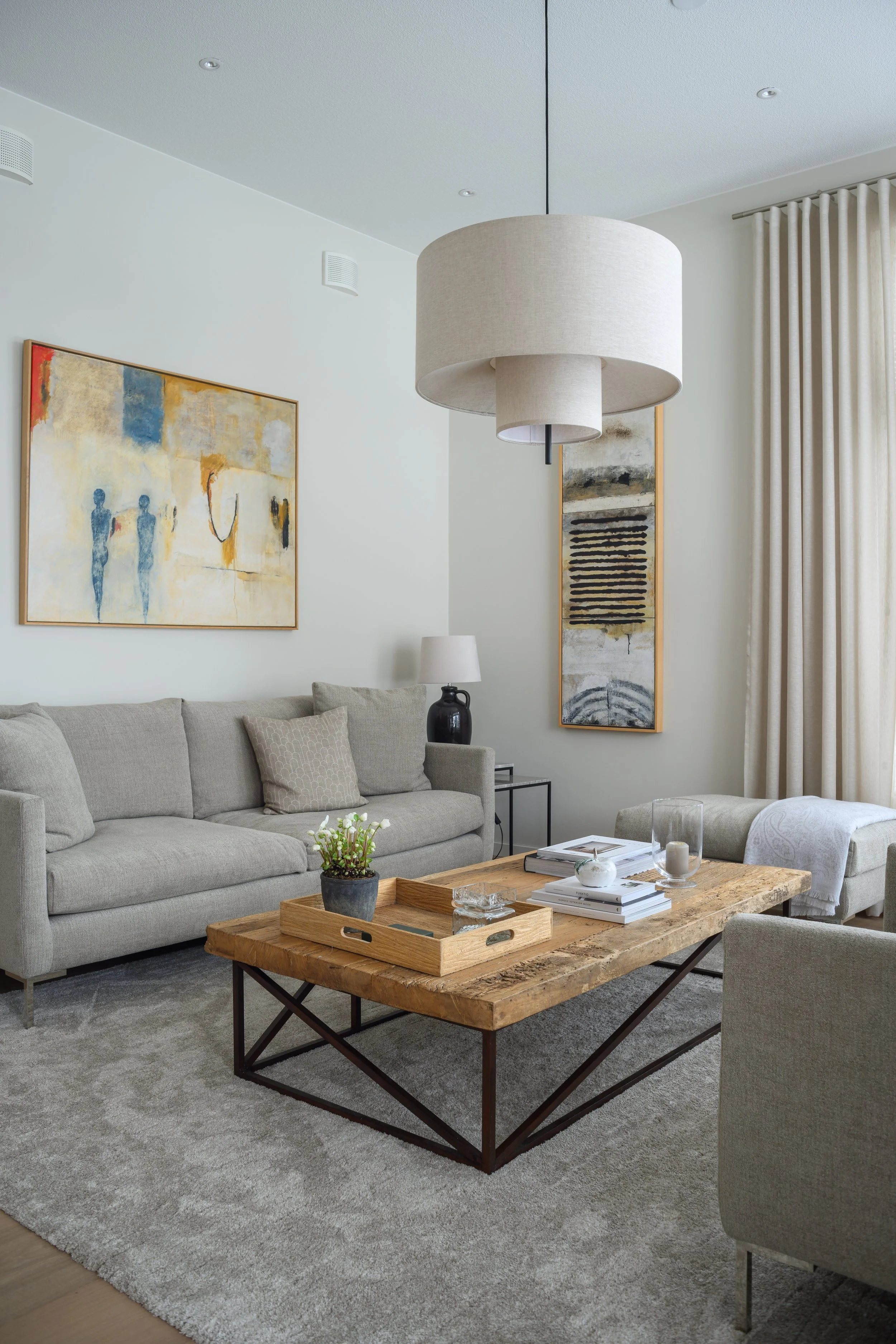 Suuren huonekorkeuden ja isojen koko seinän mittaisten ikkunoiden koettiin tekevän tilasta “kylmän” ja kolkon. Pintamateriaalien ja kiintokalusteiden materiaalivalinnoilla saatiin tilaan haluttua lämpöä. Tekstiili-, irtokaluste- ja valaisinvalinnoilla viimeisteltiin pehmeä, mutta moderni tunnelma.